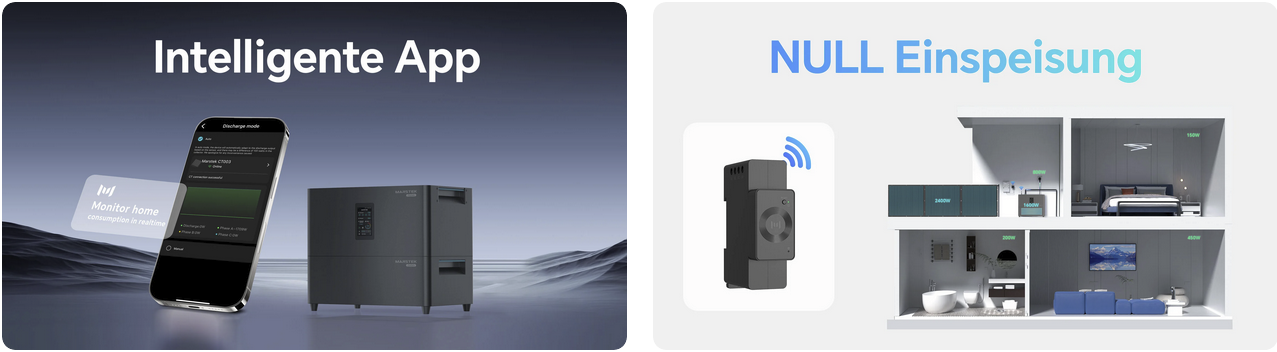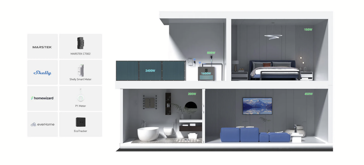 Der Jupiter C+ liest kontinuierlich die Leistungsdaten des Smart Meters aus und passt die Ausgangsleistung auf der Grundlage der Echtzeitdaten dynamisch an, so dass keine Einspeisung ins Netz erfolgt und die Energieeffizienz erhöht wird. Unterstützte Smart Meter sind Marstek CT002/CT003, Shelly Smart Meter, HomeWizard P1 Meter, etc.